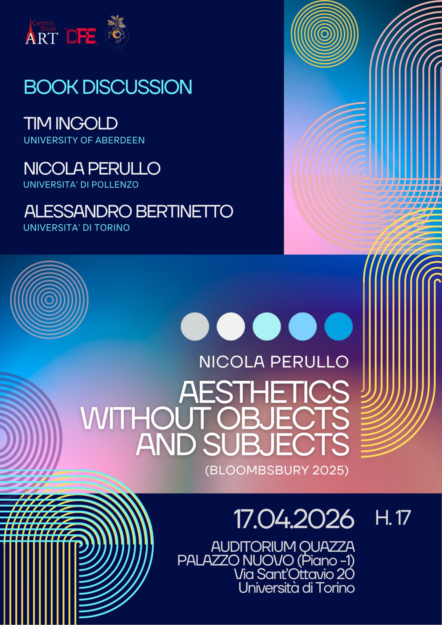 Venerdì 17 aprile presso l’auditorium Quazza a Palazzo Nuovo, all’Università degli Studi di Torino il prof. Perullo discuterà con Tim Ingold e Alessandro Bertinetto, professore ordinario di Estetica dell’ateneo torinese, il suo libro “Aesthetics without Objects and Subjects” edito da Bloomsbury Publishing.